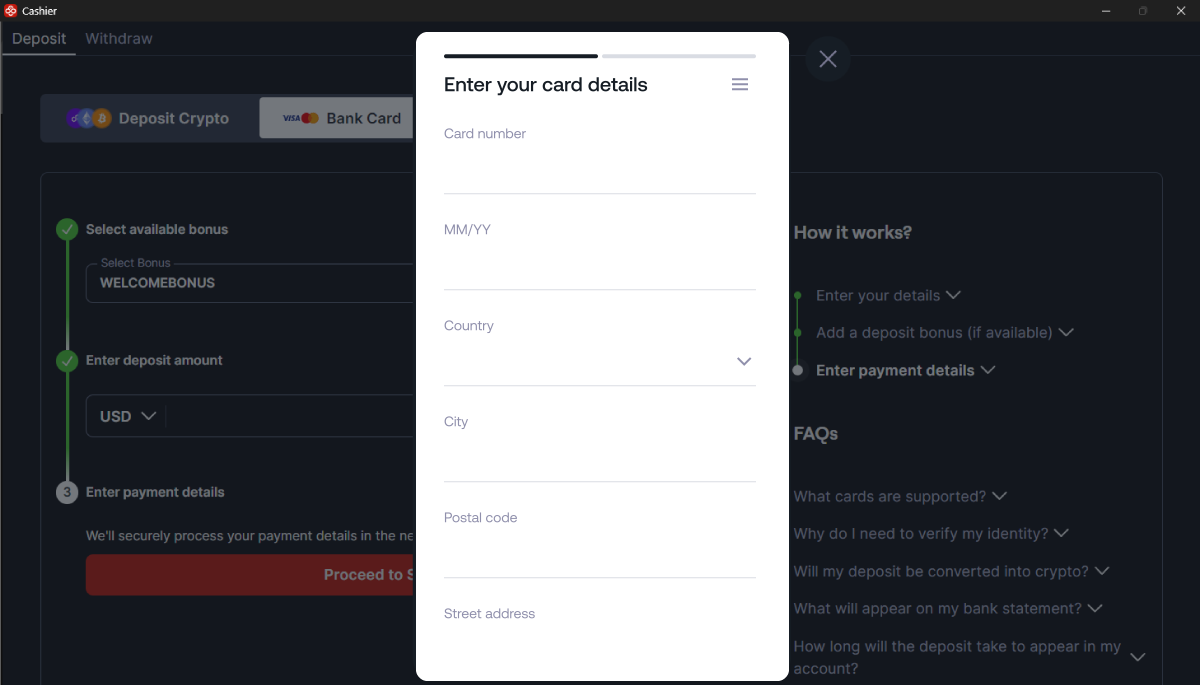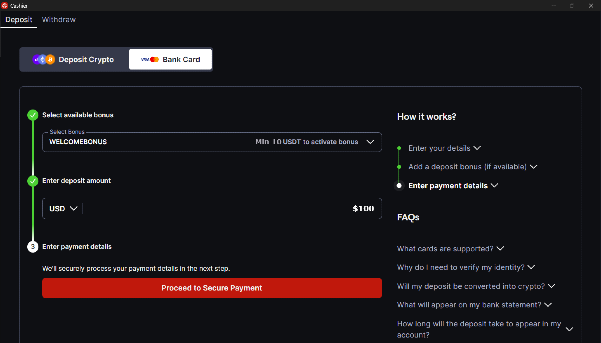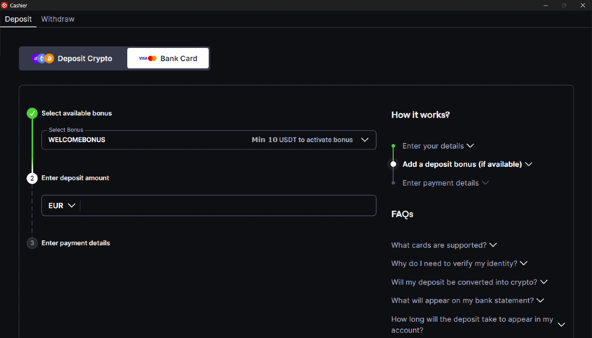 Siga las instrucciones que se indican a continuación para realizar un depósito en CoinPoker con su tarjeta bancaria.