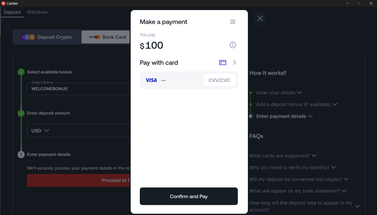 Comprueba que el importe que deseas depositar es correcto e introduce el código CVV/CVC de tu tarjeta. A continuación, haga clic en “Confirmar y Pagar.”