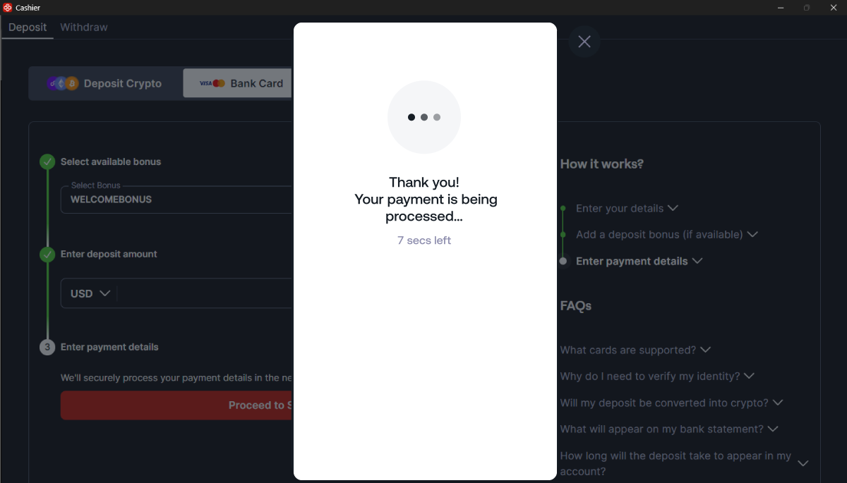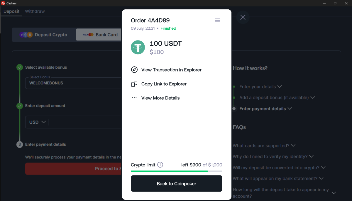 ¡Eso es todo! La mayoría de las transacciones de este tipo son instantáneas y, tras completar los pasos, los fondos se abonan al instante. En algunos casos, podría haber un retraso de 24 horas debido a los procesos de pago de los bancos, que están fuera del control de CoinPoker.