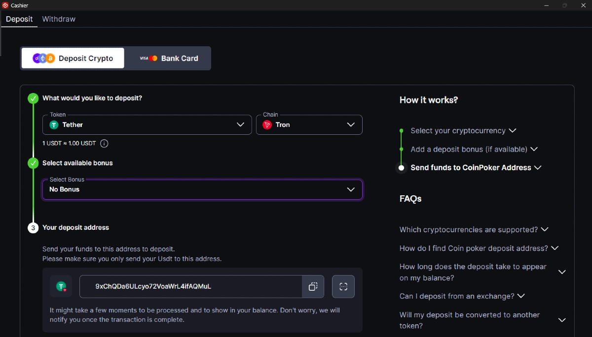 Puedes hacer depósitos desde wallets de criptomonedas personales o desde exchanges, directamente a tu cuenta de CoinPoker. El proceso es sencillo, rápido, y CoinPoker no cobra ninguna tarifa de depósito.