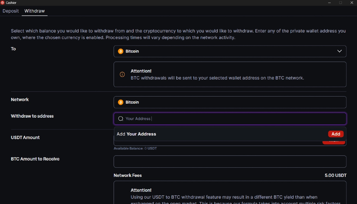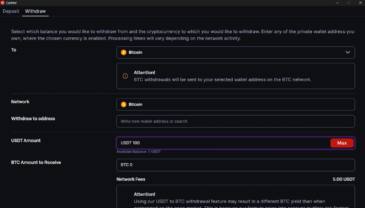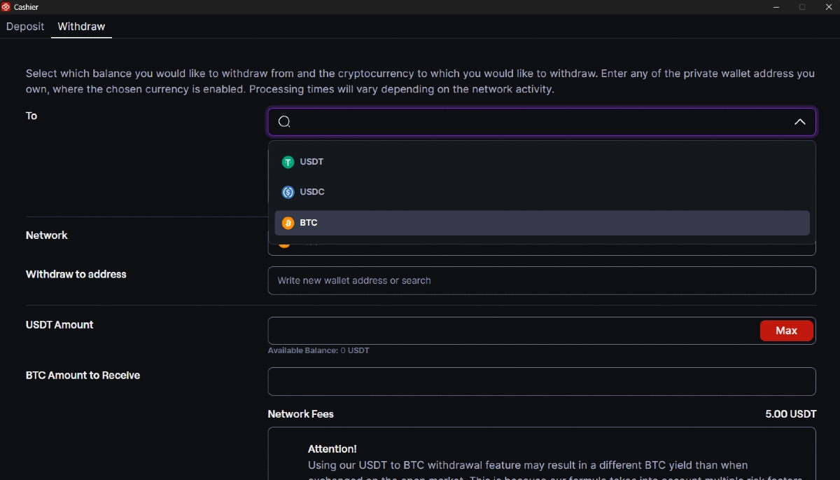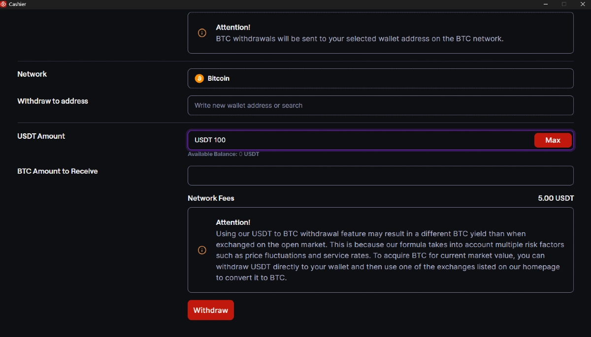 - Tarifa de USDT a BTC = Alrededor de 1 USDT (Por favor, verifica el Cajero en la app de CoinPoker para la tarifa de BTC actualizada)