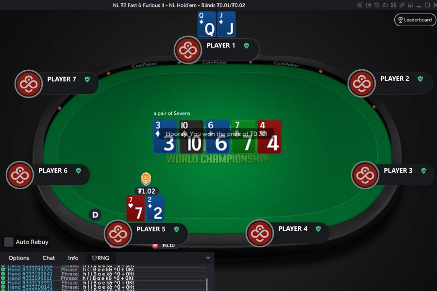 El Seven Deuce Game de CoinPoker paga una recompensa de 5BB de cada jugador siempre que alguien gana una mano teniendo 7-2 (suited u offsuit).