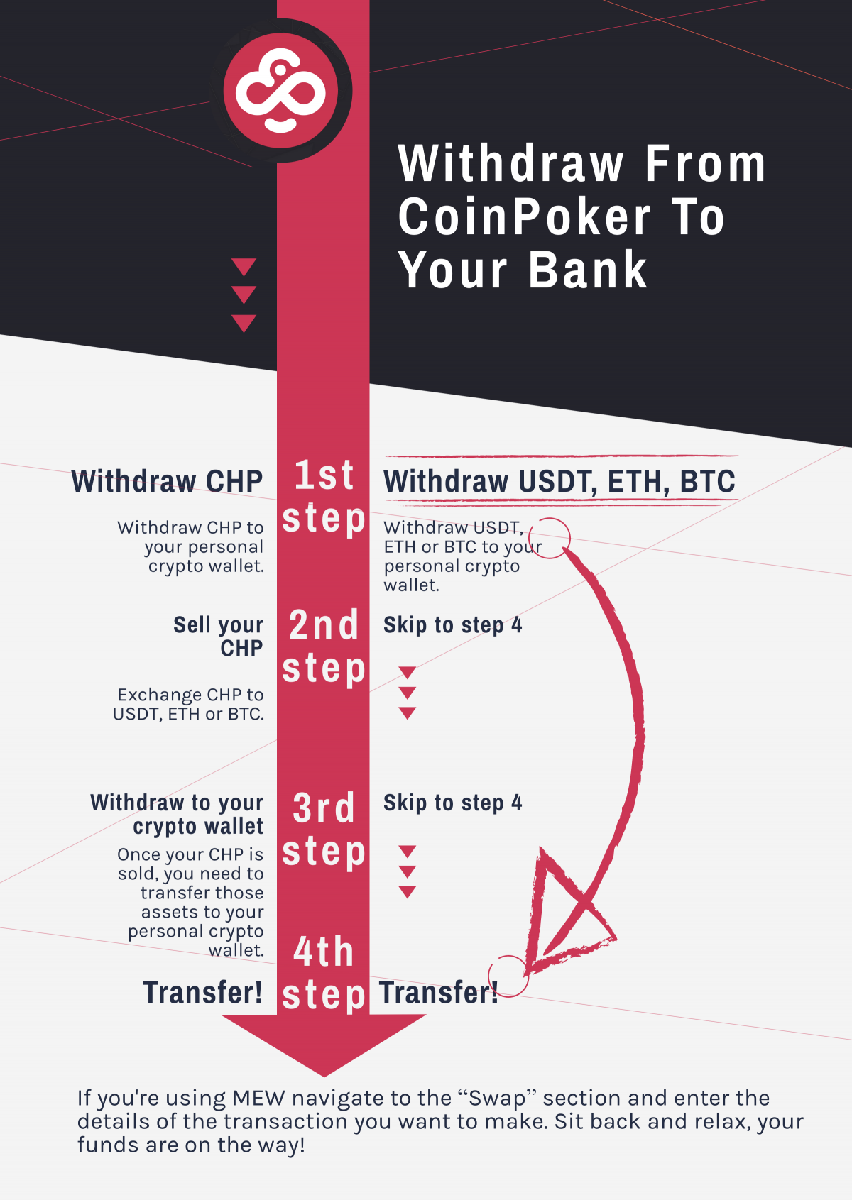 Going from fiat on your bank account to CHP on your CoinPoker account takes a couple of hours. Withdrawing CHP from CoinPoker and converting it to fiat on your bank account might take 2 to 24 hours (depending on the time of the day the withdrawal is performed). Withdrawals can also be made using USDT, ETH or BTC.
